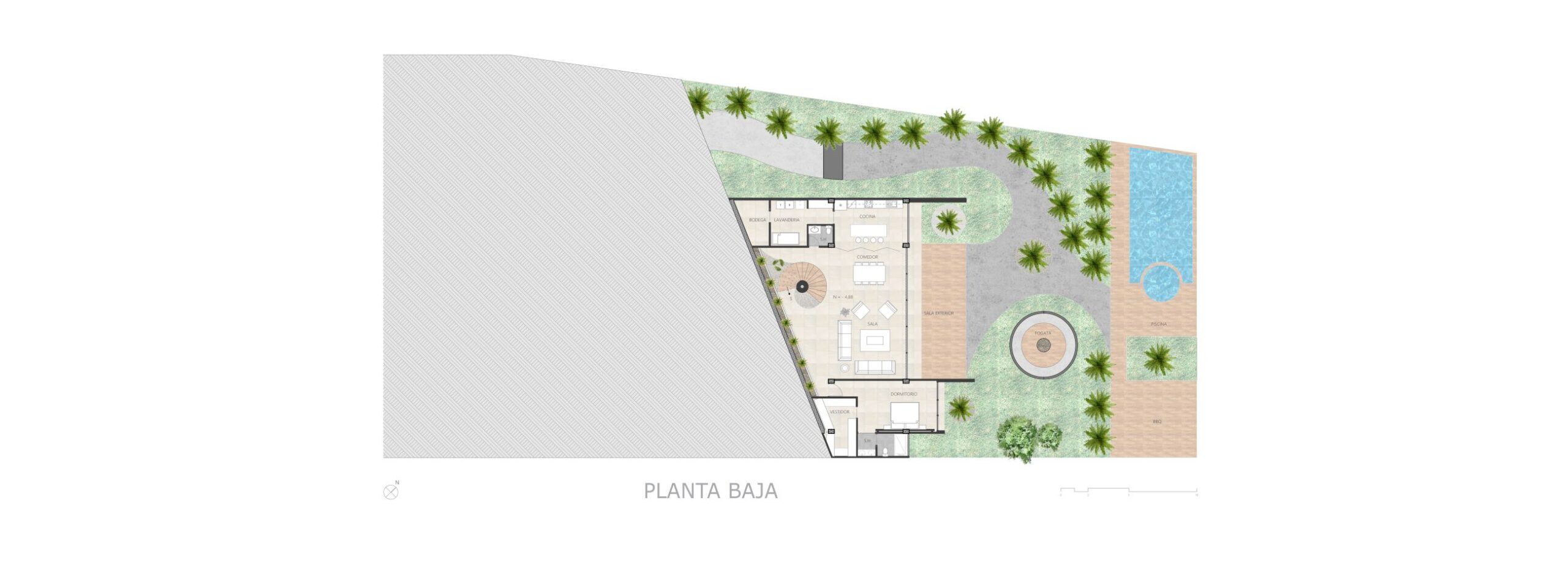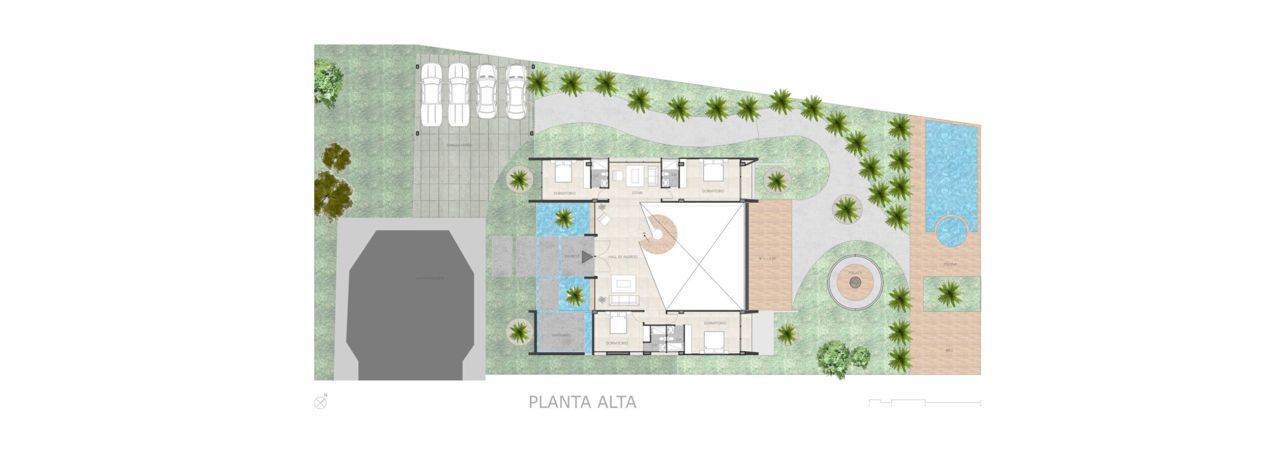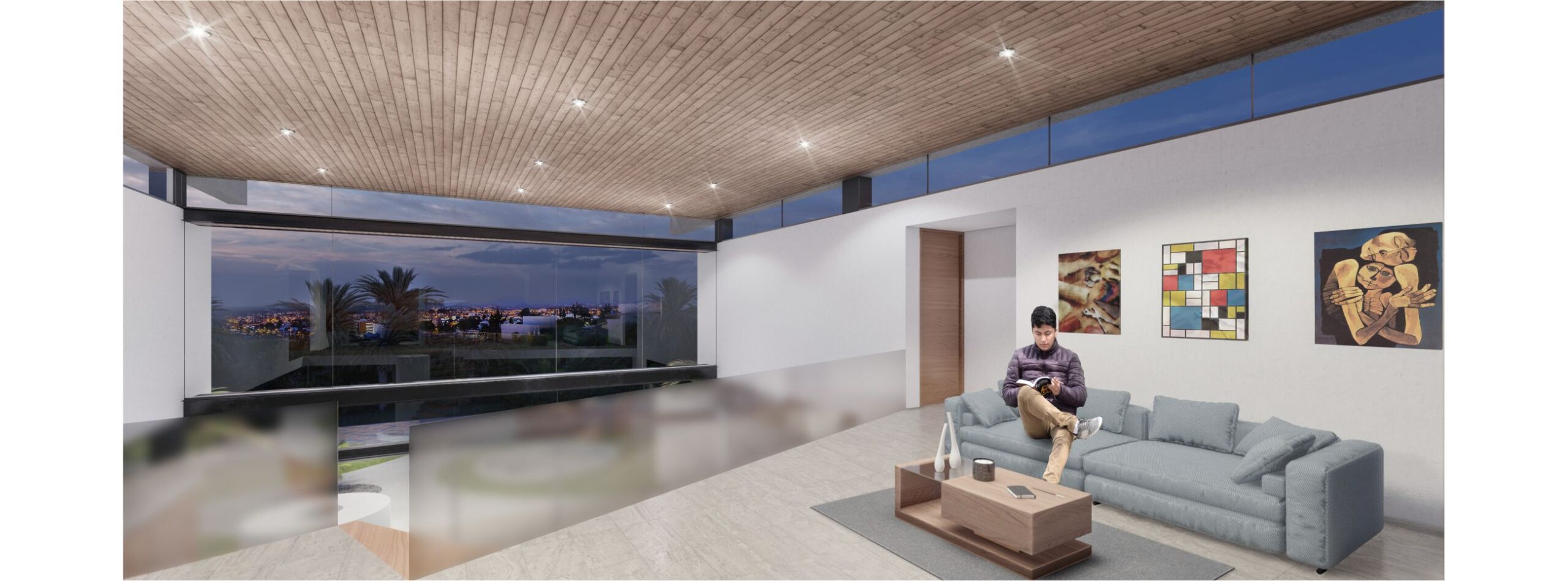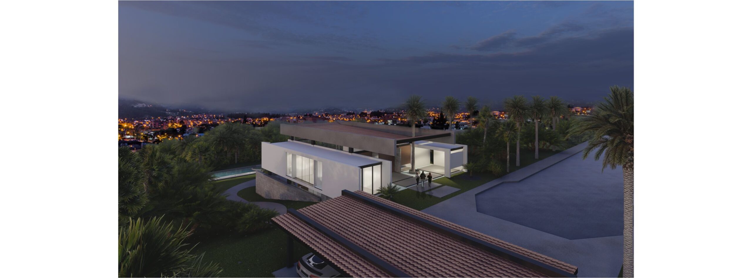 Una vivienda que aprovecha la topografía accidentada, se asienta en terrazas creando espacios a doble altura mirando hacia la ciudad.