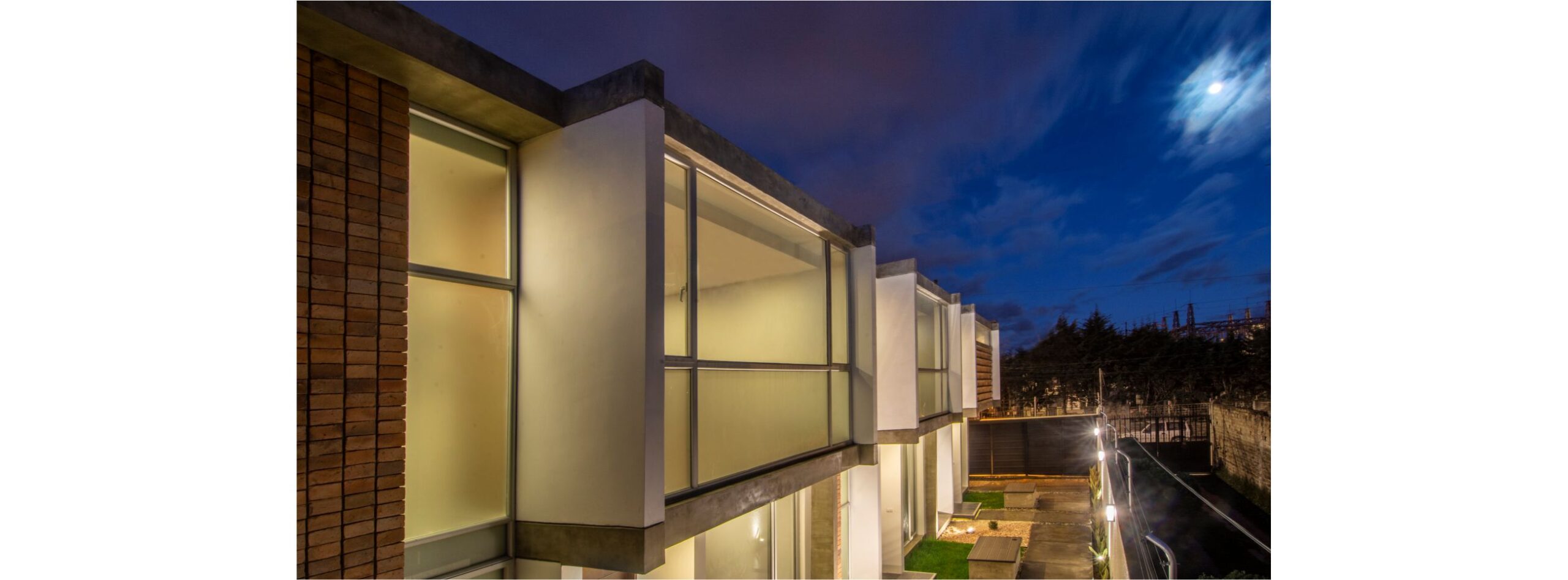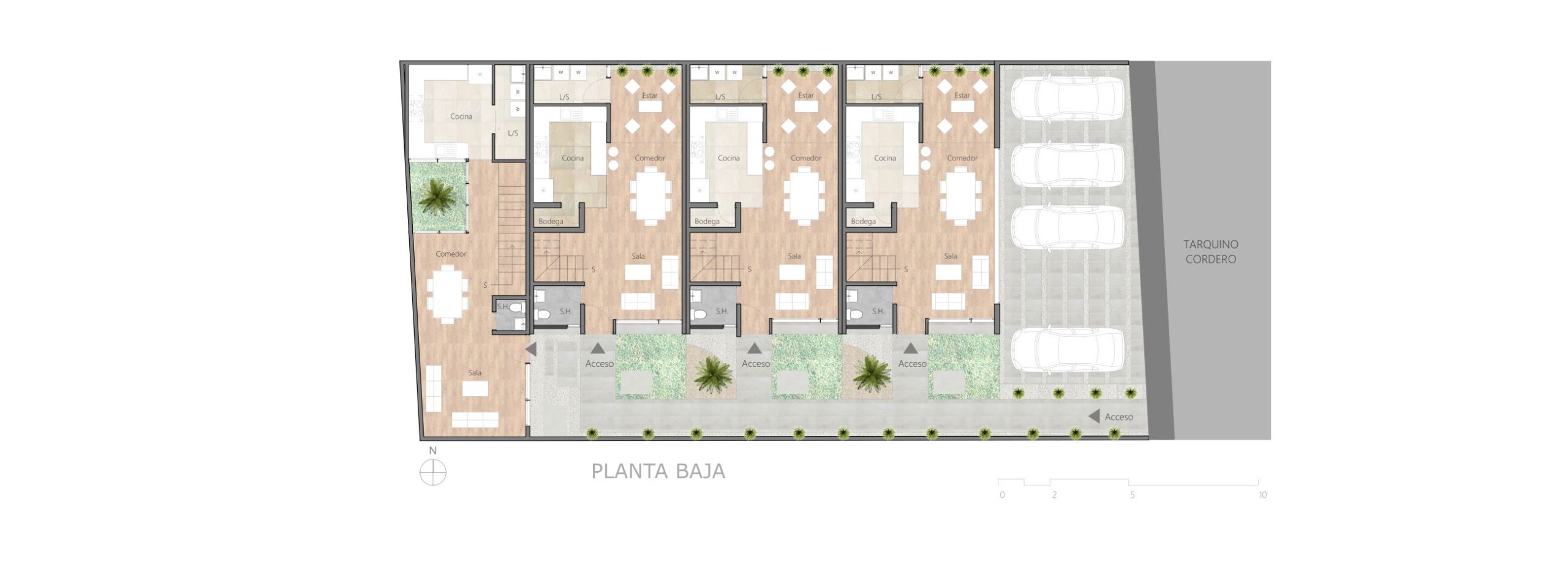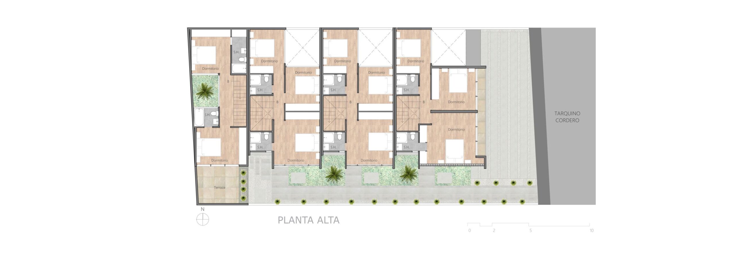 Cuatro viviendas, unidas por un patio, permite crear lazos de amistad con los vecinos y poder disfrutar de esta área comunal contemplando los muros de ladrillo, la vegetación y el paisaje.