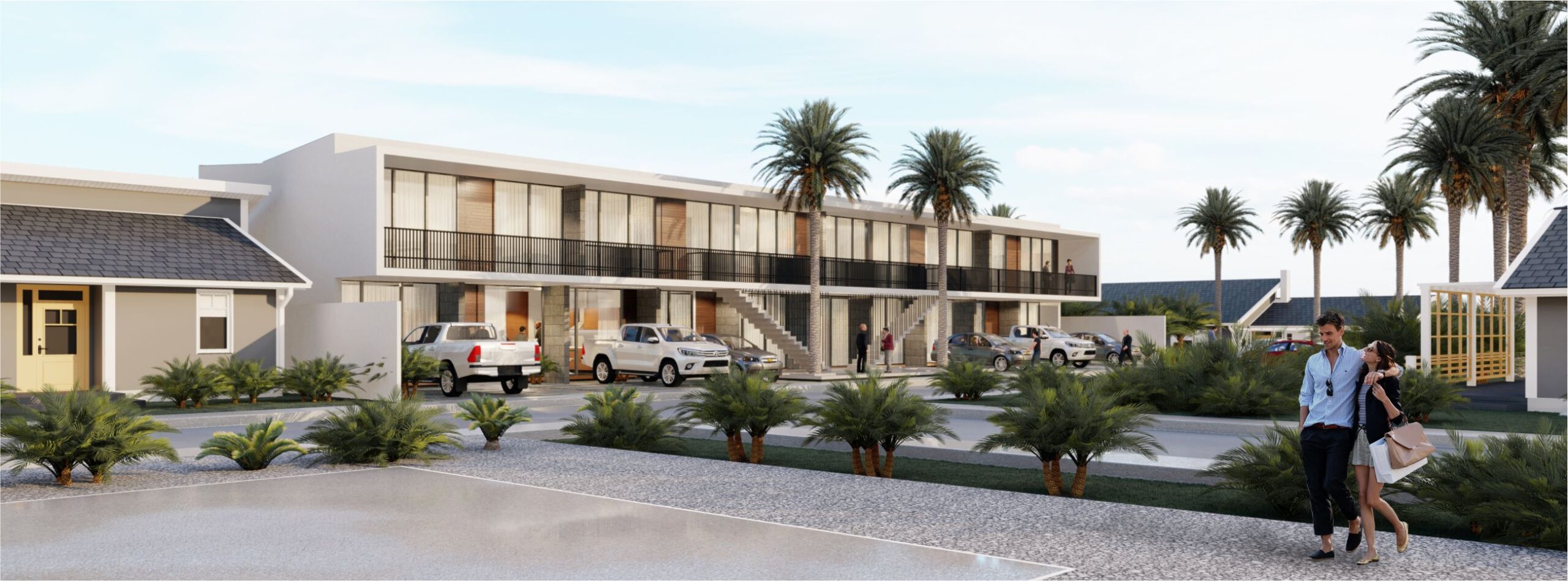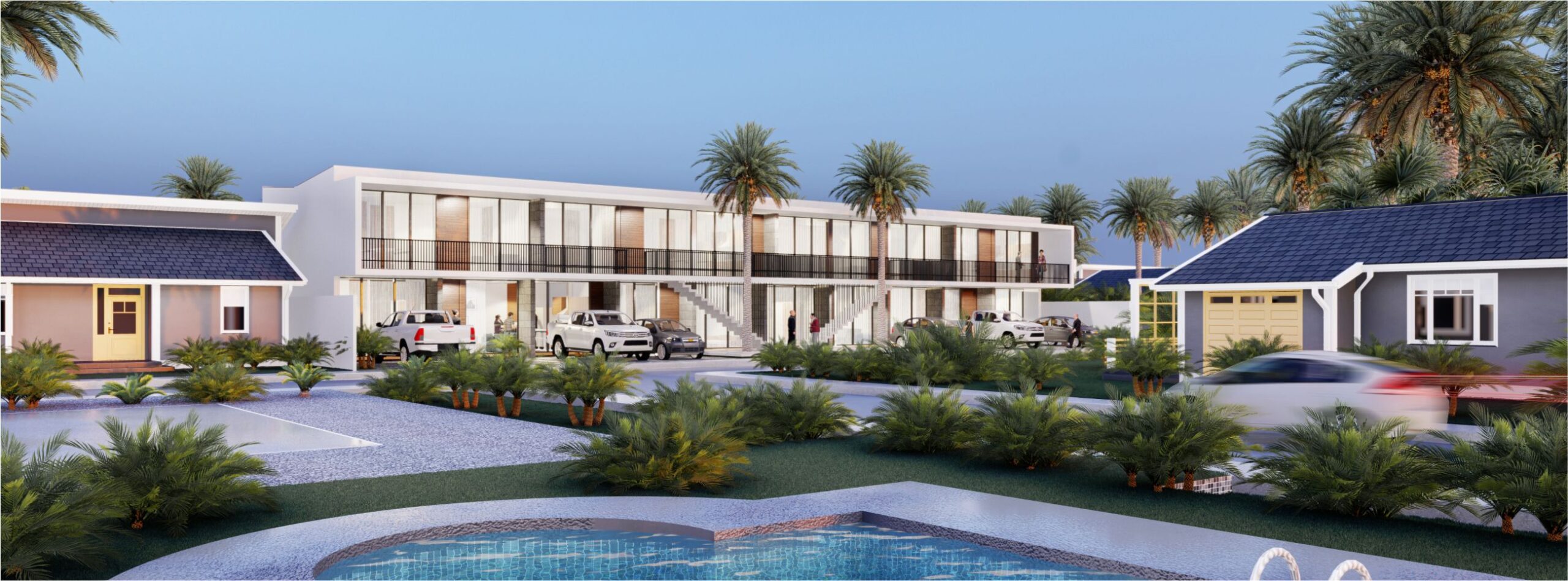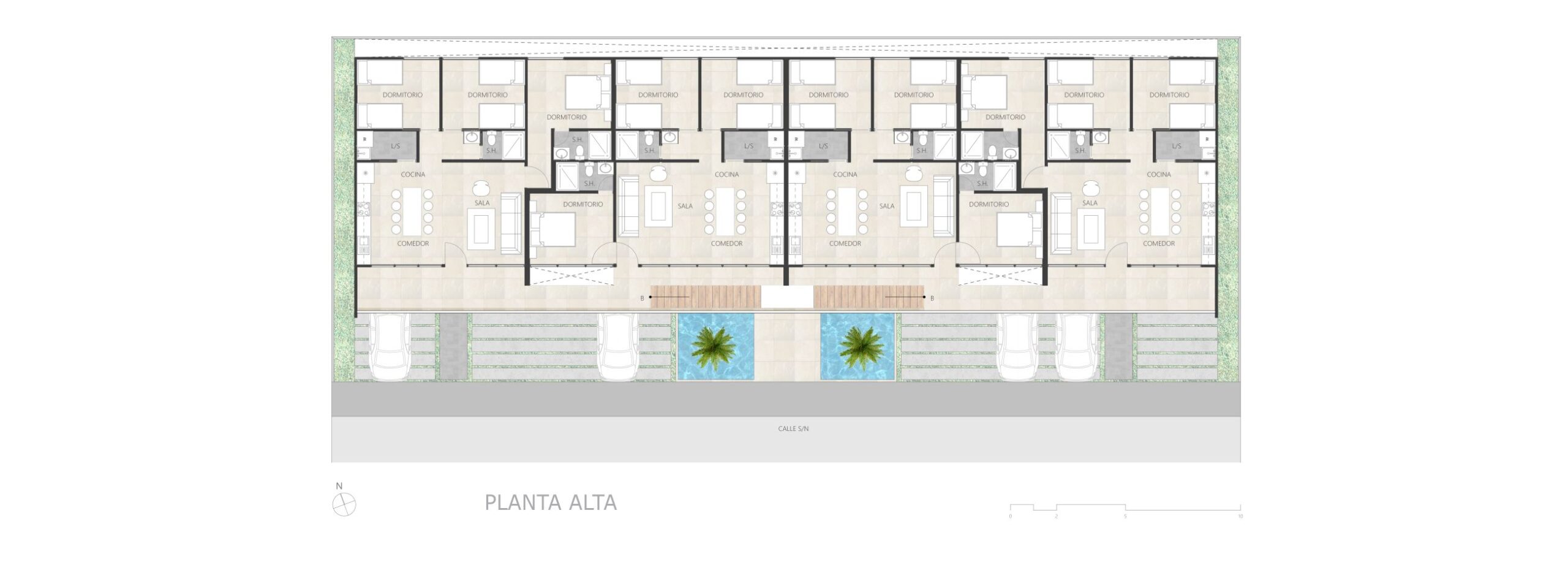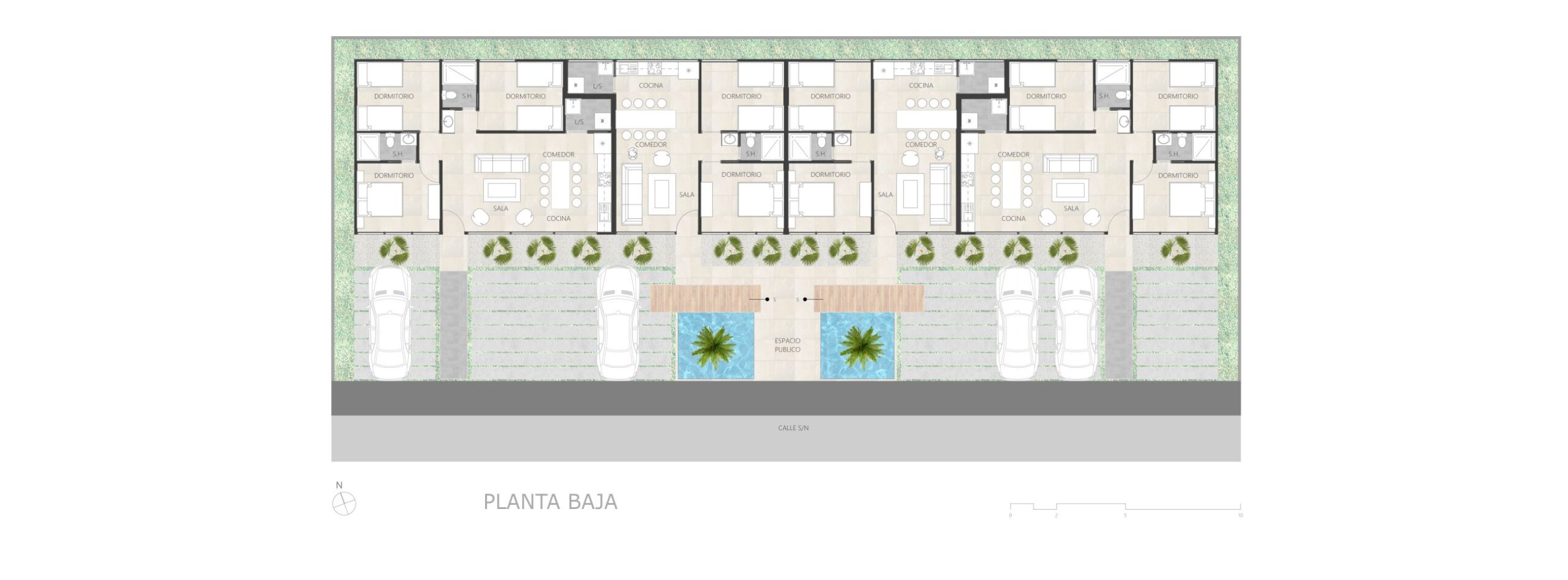 Ocho departamentos unidos por un acceso generoso junto a unos espejos de agua y vegetación brindan espacios de calidad.