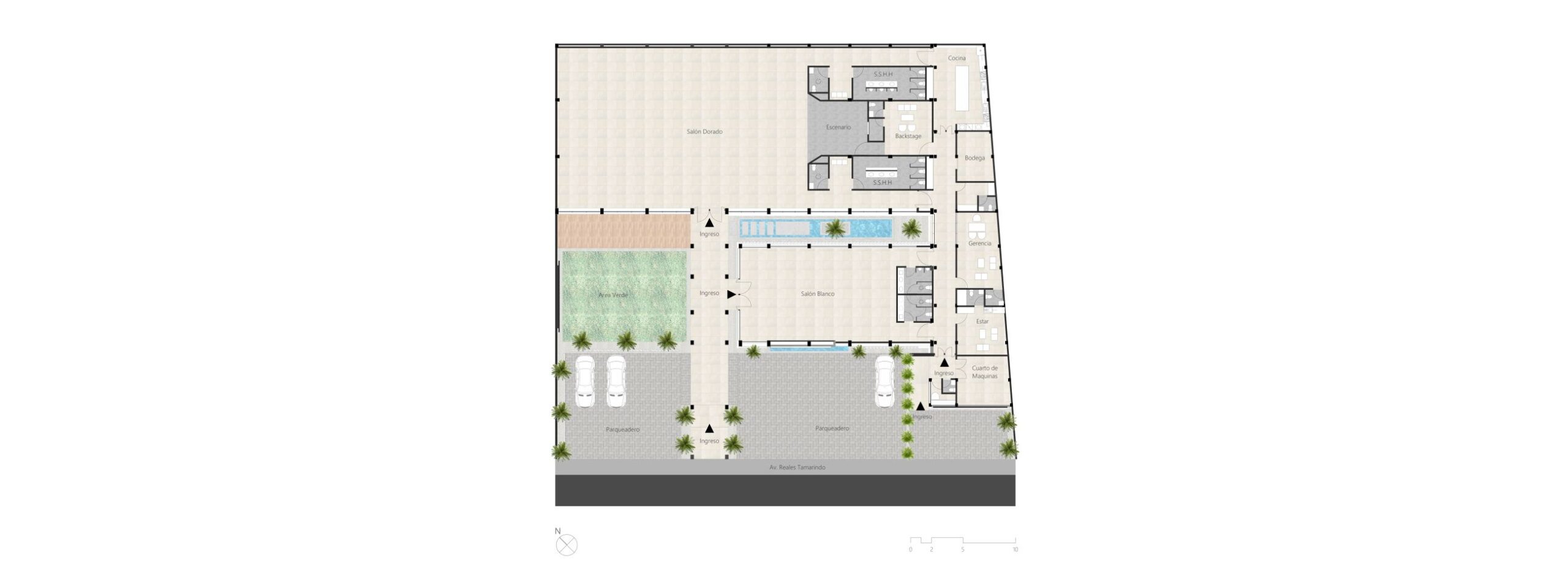 Un local de eventos con acceso libre se integra a la ciudad, creando espacios innovadores, reduce la incidencia solar teniendo espacios confortables.
